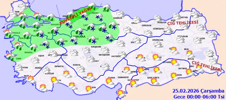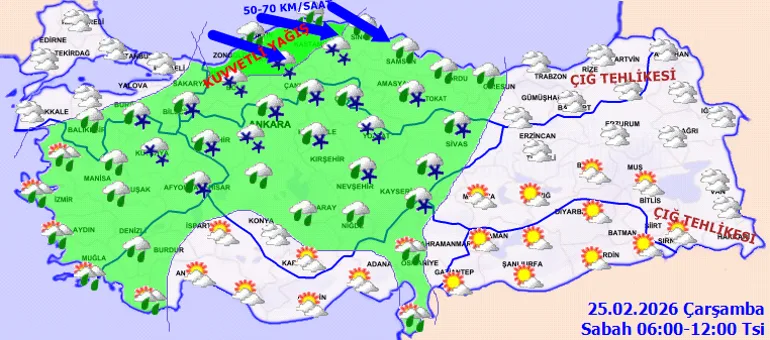 Meteoroloji Genel Müdürlüğü verilerine göre 25 Şubat'ta Türkiye genelinde parçalı ve çok bulutlu bir hava bekleniyor. Marmara, Ege, Akdeniz, İç Anadolu, Batı ve Orta Karadeniz, Doğu Karadeniz (Artvin hariç), Doğu ve Güneydoğu Anadolu'nun batısı ile Van ve Hakkari çevrelerinde yağış öngörülüyor. Yağışlar çoğunlukla yağmur ve sağanak, iç ve yüksek kesimlerde ise karla karışık yağmur ve kar şeklinde olacak.