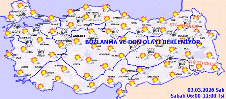 Gece ve sabah saatlerinde iç ve doğu bölgelerde buzlanma ve don görülebilir. Marmara, iç ve batı kesimlerde ise sis ve pus etkili olabilir. Doğu Karadeniz’in iç kesimleri ile Doğu Anadolu’nun yüksek kar örtüsüne sahip eğimli alanlarında çığ ve kar erimesi riski bulunuyor.