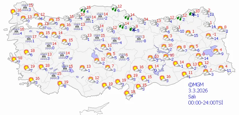 Meteoroloji Genel Müdürlüğü'nün 3 Mart için yaptığı değerlendirmeye göre, Türkiye genelinde yağış beklenmiyor. Kuzey bölgelerde hava parçalı ve çok bulutlu, diğer bölgelerde ise parçalı ve az bulutlu olacak.