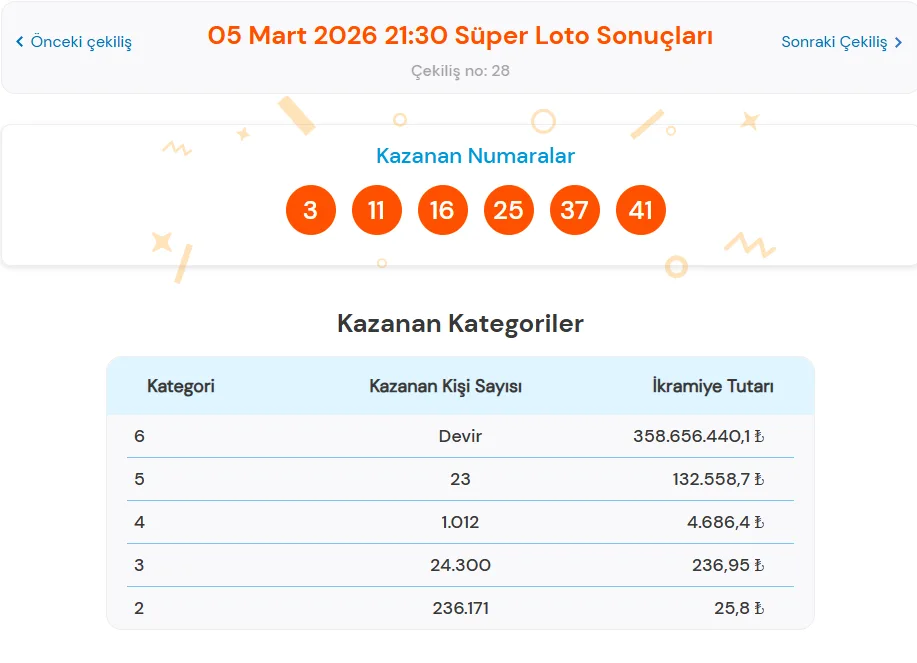 5 Mart 2026 tarihli Süper Loto sonuçları açıklandı. Çekilişte 6 bilen çıkmadı ve 358.656.440,1 TL ikramiye devretti.