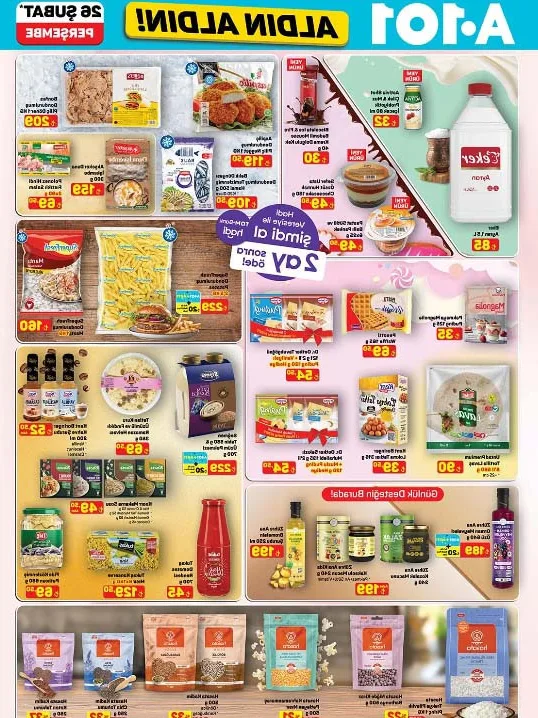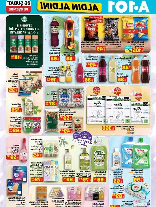 Gıda ve temizlik ürünleri arasında ayran 1,5L 85 TL, hurmalı cheesecake 150g 49,50 TL, dondurulmuş mantı 1 kg 160 TL, tortilla lavaş 8'li 90 TL, kahve şurubu 52,50 TL, kozalak macunu 199 TL, double soft çocuk bezi 360 TL, yüzey temizleyici 2,5L 99 TL, gül suyu 400 ml 59,50 TL, sıvı sabun 3L 99,50 TL yer alıyor.