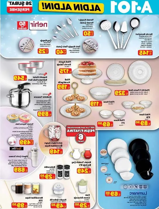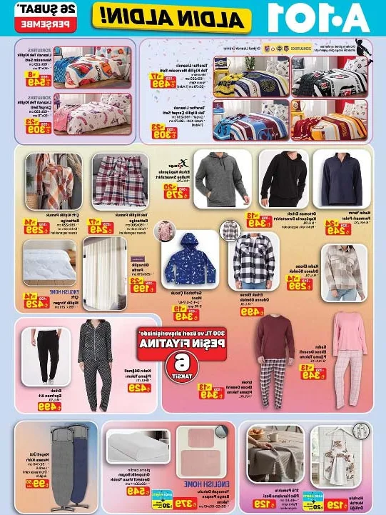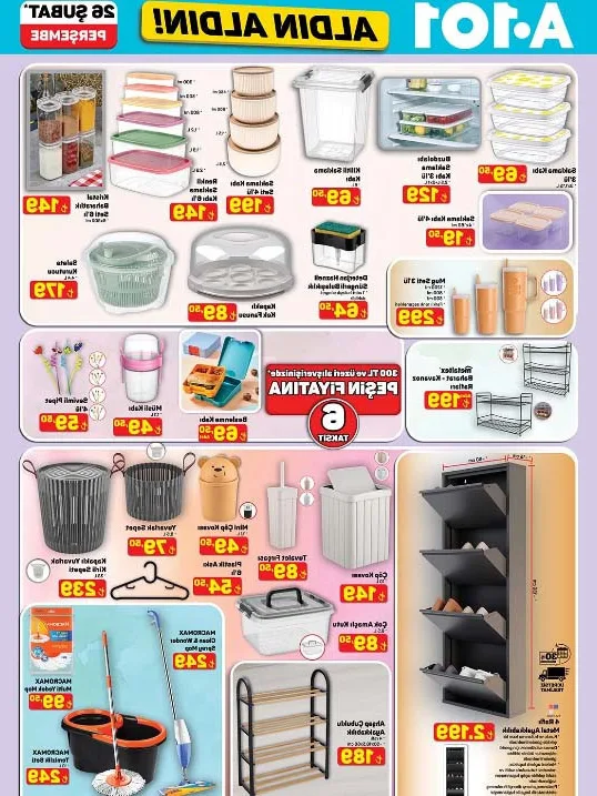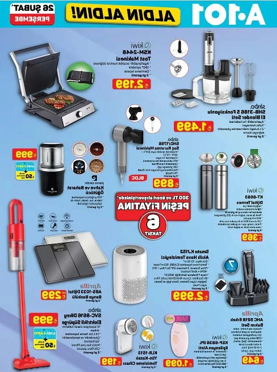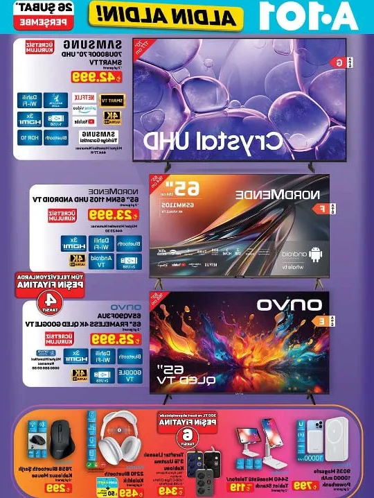Öne çıkan ürünler arasında 65 inç frameless 4K QLED Google TV 25.999 TL, 70 inç UHD Smart TV 42.999 TL, 4.00 çekme karavan 329.000 TL, 6500 Flat Tiny House 399.000 TL, elektronik para kasası 999 TL, akıllı hava temizleyici 2.999 TL, 8 kg çamaşır makinesi 18.999 TL, no-frost buzdolabı 21.999 TL, mini buzdolabı 4.799 TL, su sebili 5.499 TL, fonksiyonlu el blender seti 1.499 TL, tost makinesi 2.199 TL, dikey elektrikli süpürge 999 TL, erkek bakım seti 649 TL, bluetooth kulaklık 459 TL, bluetooth şarjlı kablosuz mouse 299 TL, masaüstü telefon/tablet standı 119 TL, projeksiyonlu çizim ve eğitim masası 679 TL, oyuncak Batman figürü 599 TL, Elsa/Anna bebek 499 TL, oyuncak çantalı lego 219 TL, lisanslı 1000 parça puzzle 69,50 TL, ben neyim? kutu oyunu 99,50 TL, servis gereçleri 145 TL, fileli 6+1 pasta seti 329 TL, kapaklı metal saklama seti 549 TL, pipetli çelik termos 689 TL, 4 raflı metal ayakkabılık 2.199 TL, temizlik seti 249 TL, kapaklı yuvarlak kirli sepeti 239 TL, kristal baharatlık seti 6'lı 149 TL, mug seti 3'lü 299 TL, güneşlik perde 199 TL, çift kişilik yorgan 429 TL, havlulu mutfak önlüğü 129 TL, 3'lü pamuklu pike kurulama seti 129 TL, keçeli ütü masası kılıfı 99,50 TL, ortopedik boyun destekli visco yastık 549 TL, yumuşak dokulu banyo paspas takımı 379 TL, çift kişilik pamuk battaniye 299 TL, tek kişilik pamuk battaniye 249 TL gibi ürünler bulunuyor.