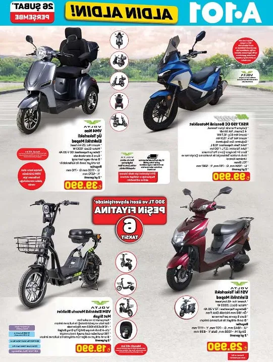 Katalogda ayrıca VM4 üç tekerlekli elektrikli moped 39.990 TL, VSM elektrikli motorlu bisiklet 19.990 TL, RSX7 150CC benzinli motosiklet 99.990 TL, VS1 iki tekerlekli elektrikli moped 29.990 TL gibi ulaşım araçları da bulunuyor.