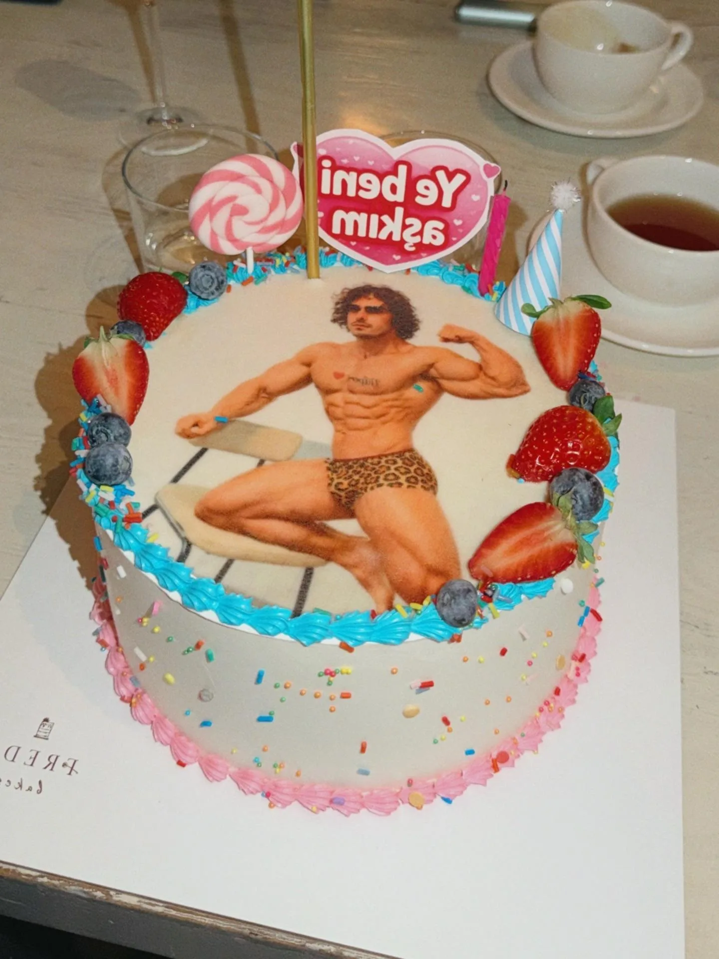 Partide en çok konuşulan detay, pastanın üzerindeki tasarım oldu. Pastada, Bekar'ın leopar desenli iç çamaşırı ve kaslarını sergilediği bir fotoğrafı ile "Ye Beni Aşkım" yazısı yer aldı. Mizahi mesajı ve alışılmışın dışındaki görünümüyle pasta, davetlilerin ve takipçilerin ilgisini çekti.